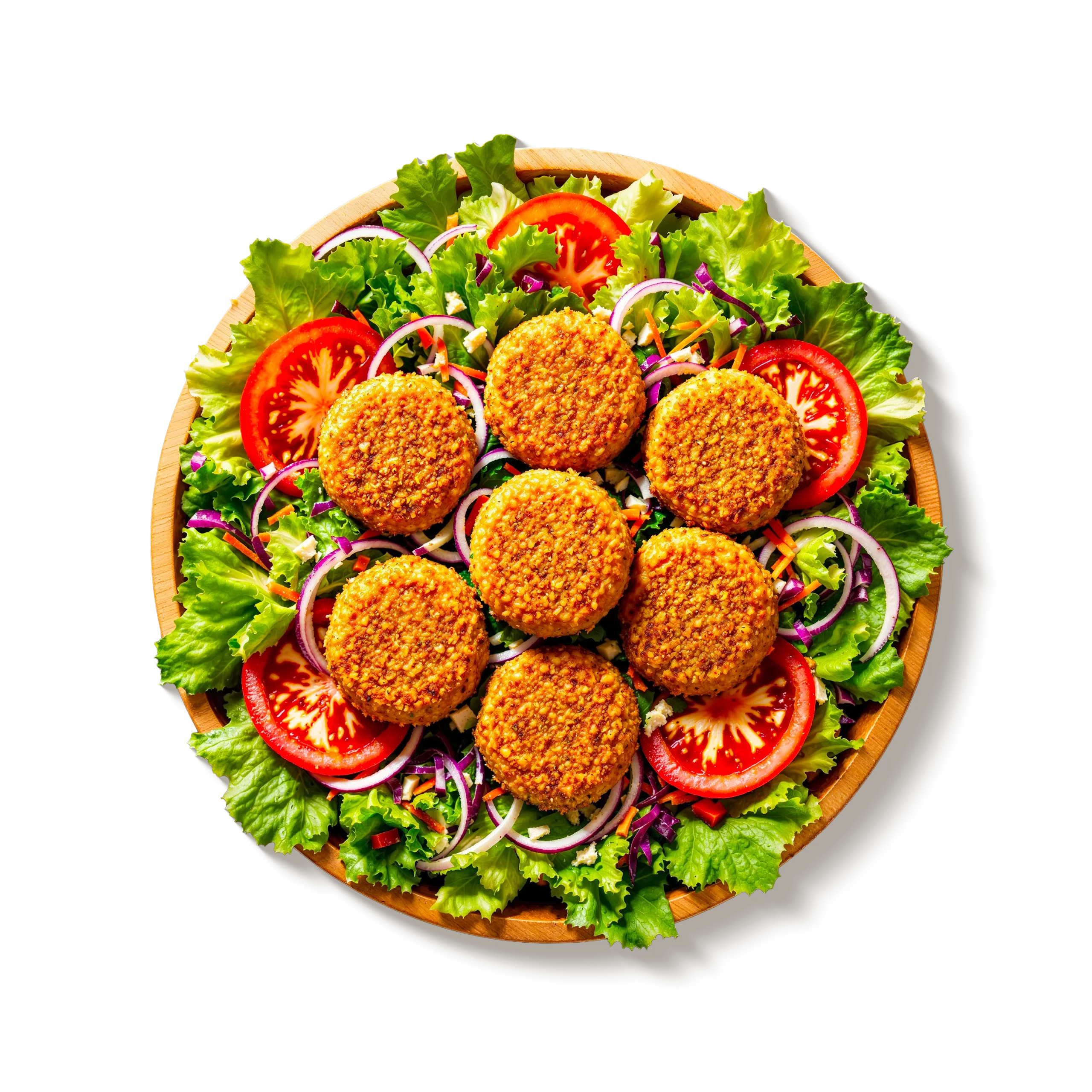 Falafels dorés et moelleux 🧆 sur lit de verdure, fraîche et généreuse, sauce au choix 🥣. Légumes au choix : 🥬 salade, 🧅 oignon rouge, 🍅 tomate, 🟣 chou rouge, 🥕 carotte râpée.